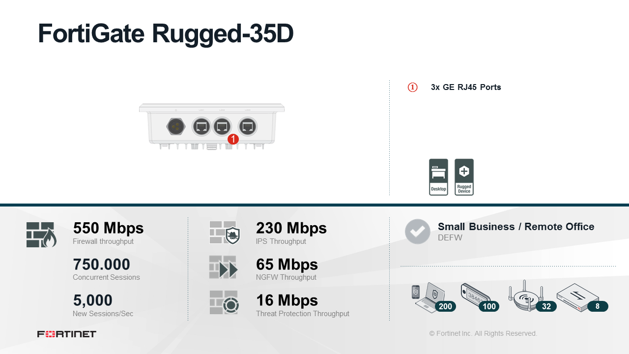 Die FortiGate Rugged 35D Serie ist eine kompakte, all-in-one Security Appliances, welche für anspruchsvolle Infrastrukturen entwickelt wurde und ihren Einsatz im Outdoor-Bereich findet. Die Serie ist ideal für kleine Unternehmen, Remote, kleine Niederlassungen und Customer Premise Equipment (CPE) sowie kleine Verkaufsstellen geeignet.
